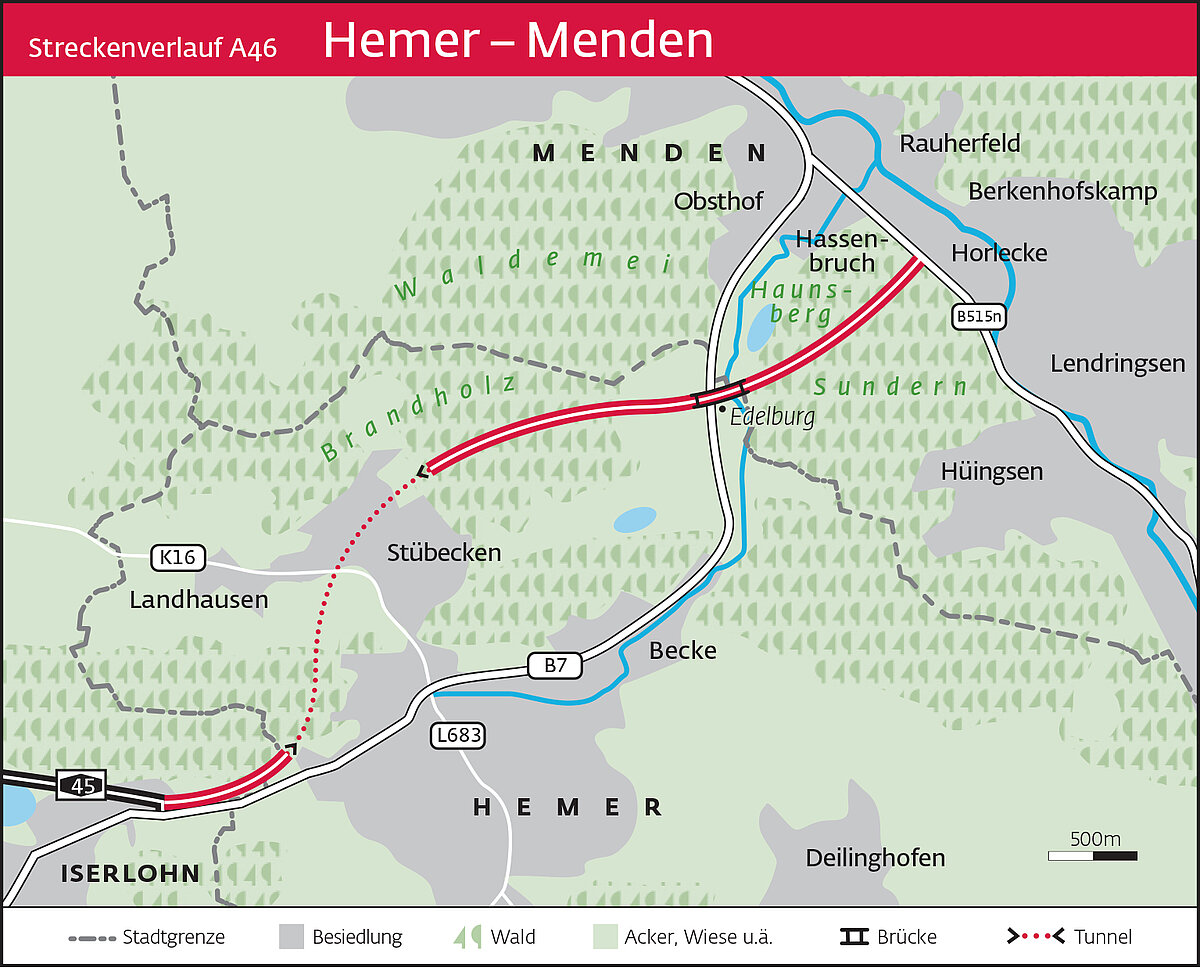 Von dort führt die Trasse als dreistreifige neue Bundesstrasse B7n zunächst mit einer mehrere hundert Meter lange Brücke über die Horlecke und die Balver Straße. Die Brücke trennt damit auch optisch Menden vom größten Ortsteil Lendringsen.