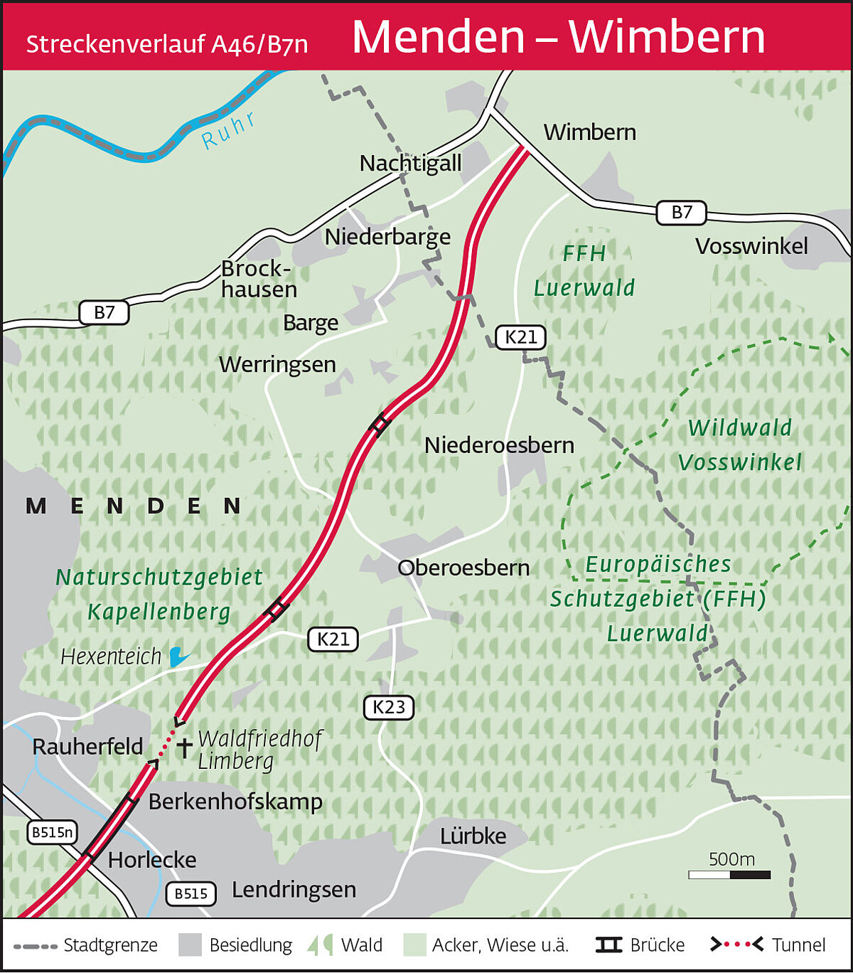 Nach wenigen Metern wird die neue Bundestrasse dann in einen Tunnel unter dem Friedhof Limberg geführt, um unmittelbar danach wenige Meter neben dem Oesberner Weg zu verlaufen. Die Trasse kreuzt wenige hundert Meter hinter dem Hexenteich den Oesberner Weg und führt unterhalb des Windrades in Oesbern in Richtung Werringsen, um abschließend zwischen Nachtigall und Wimbern an die B7 anzuschließen. Auf der Strecke zwischen Oesberner Weg und Anschluss B7 sind zwei weitere kleiner Brückenbauten vorgesehen.